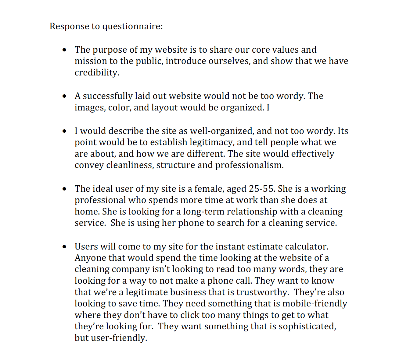 The responses shown here are from the client, in regards to a list of questions we emailed to her. From these answers, my partner and I gathered that the client wanted her site to be clean and organized without too many words. She wanted her clients to come to the site and be reassured that they would be receiving quality cleaning services in their homes and businesses.